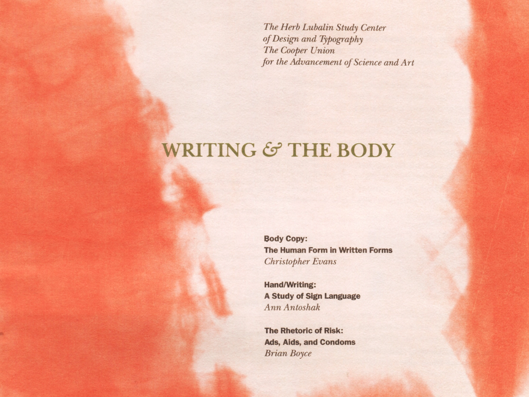 Writing and the Body was a thesis project resulting in an exhibition and publication. In order to begin with a common vocabulary for describing language, they read and discussed excerpts from Saussure’s Course in General Linguistics, from which each student found their own relationship between writing, the body, and design.