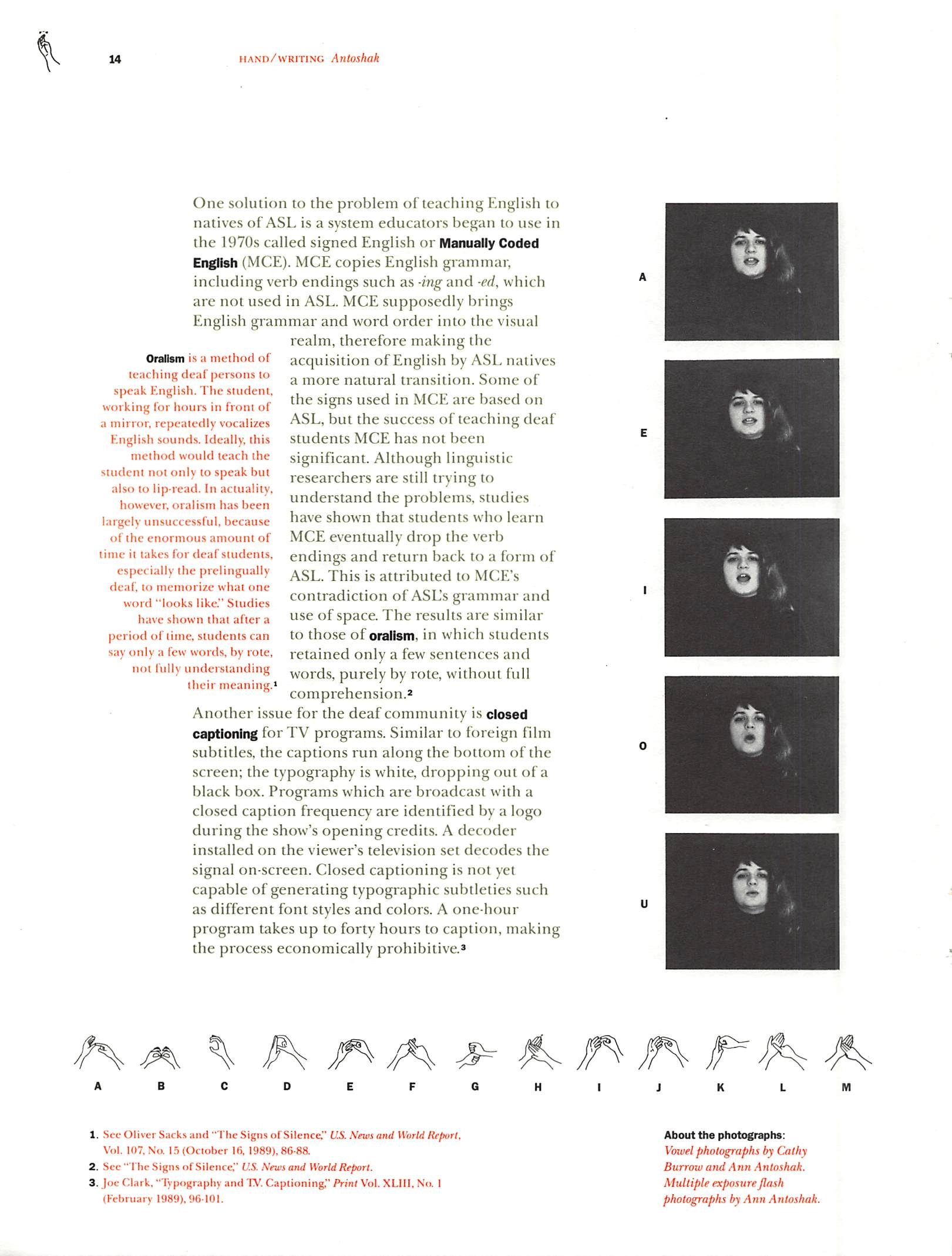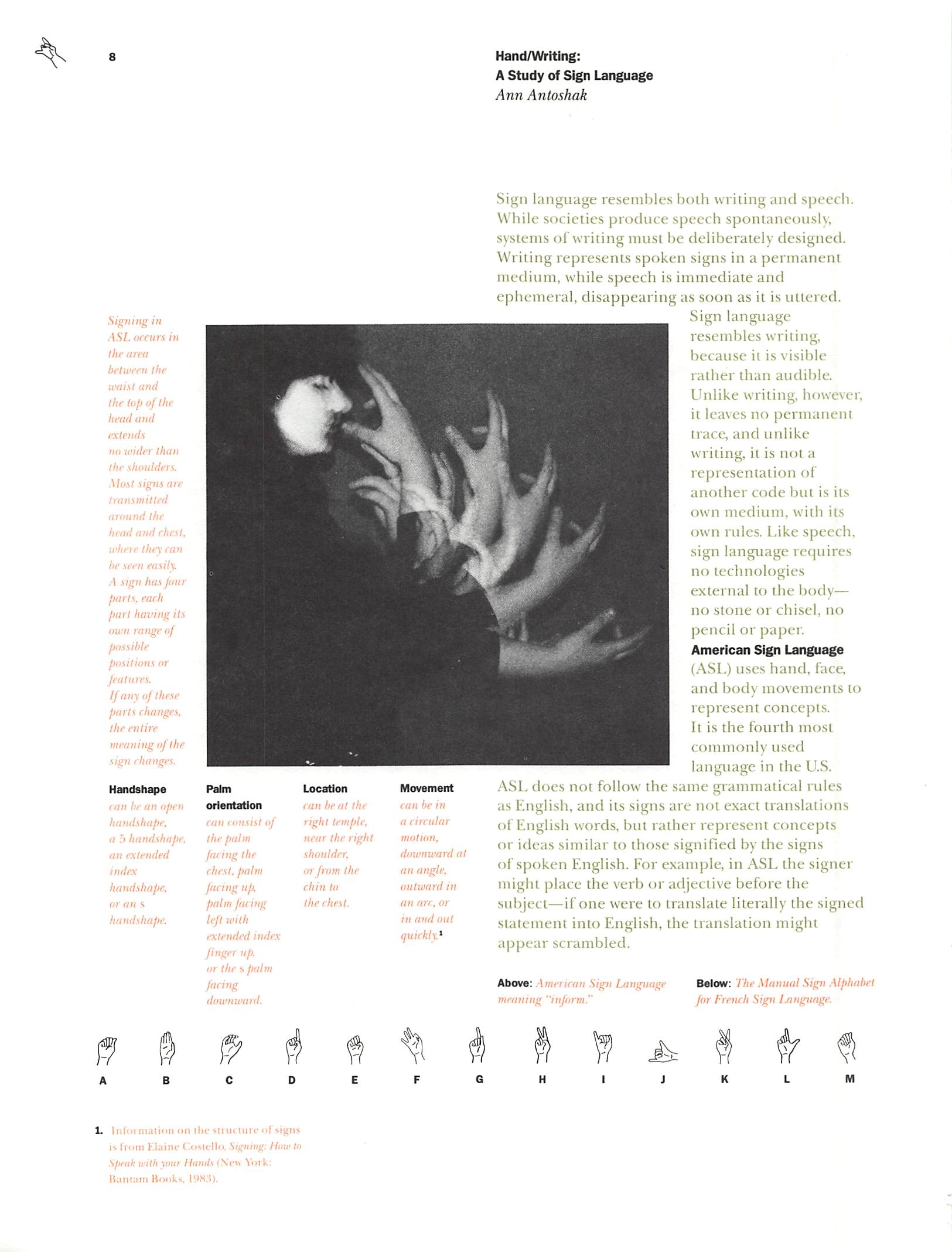Ann Antoshak investigated language systems used by the deaf, including American Sign Language (ASL), oralism, and closed captions. Like speech, Sign is used in immediate conversation between individuals, but like writing, it makes language visible. ASL has raised some political issues: should deaf education center around such a separate language, or should it develop a system more like english?