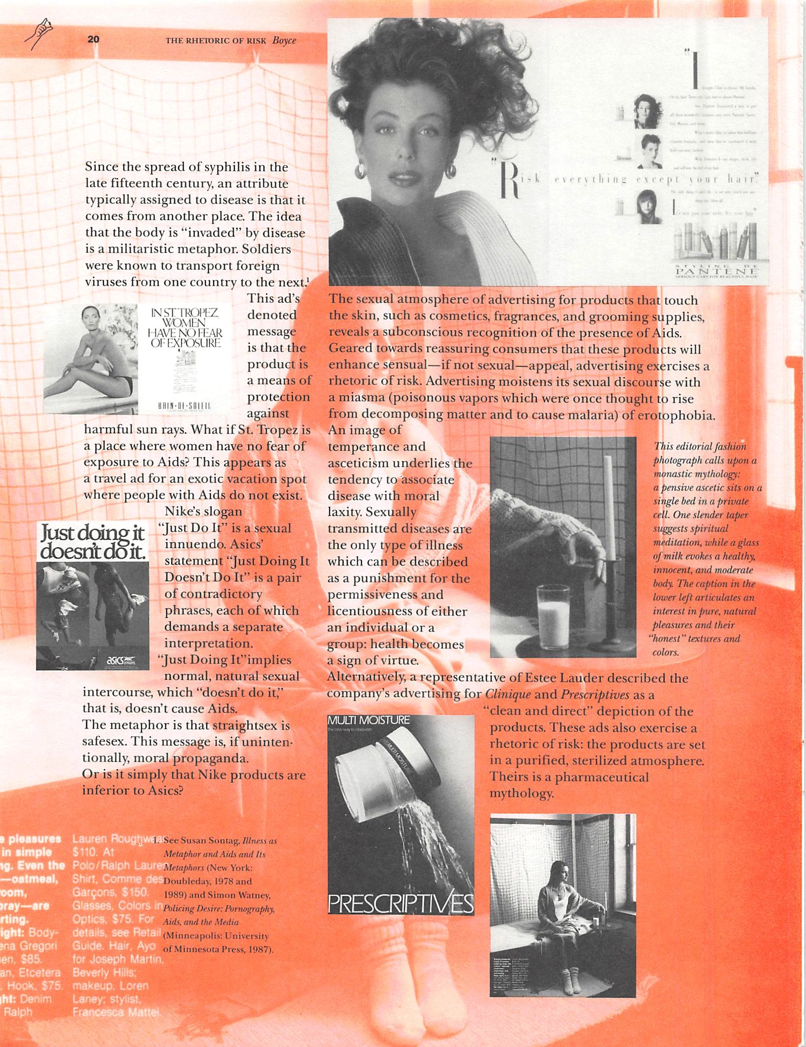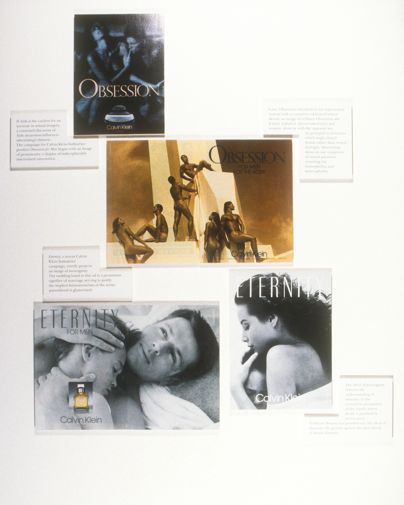 Brian Boyce looked at advertising as a semiotic medium that reflects and directs our understanding of the body. Boyce examined how monogamy, celibacy, and safersex products are represented in advertising, public service announcements, and packaging.