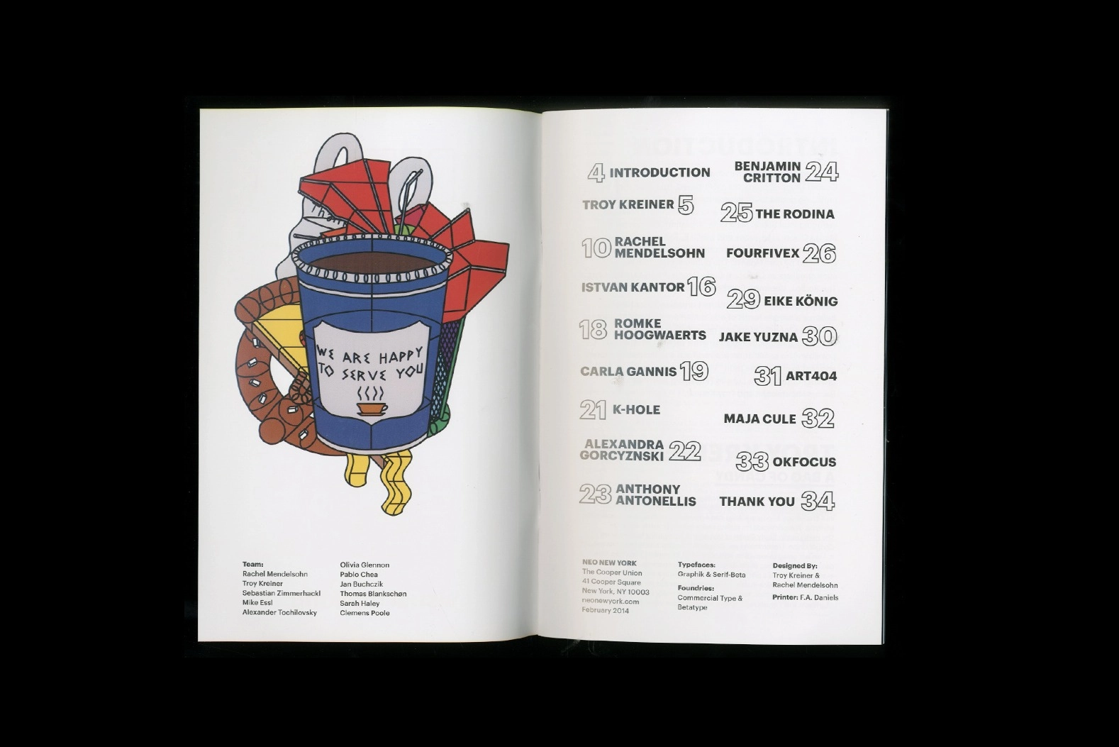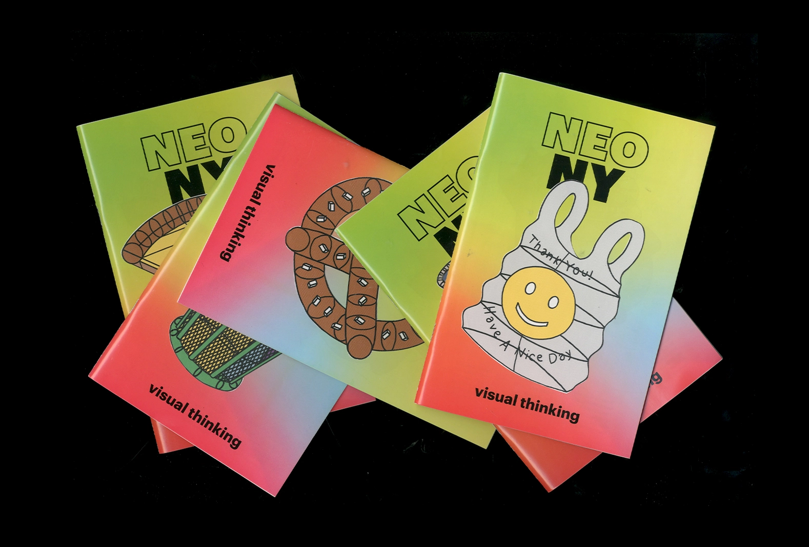 The Neo NY publication included contributions (visual and written) from a variety of creatives including the workshop founders, workshop leaders, Eike König, Benjamin Critton and more. It is intended as an artifact; a collection of images and text exploring the term “Visual Thinking.” Each cover unique with a sticker from the established visual identity featuring NY-specific illustrations.