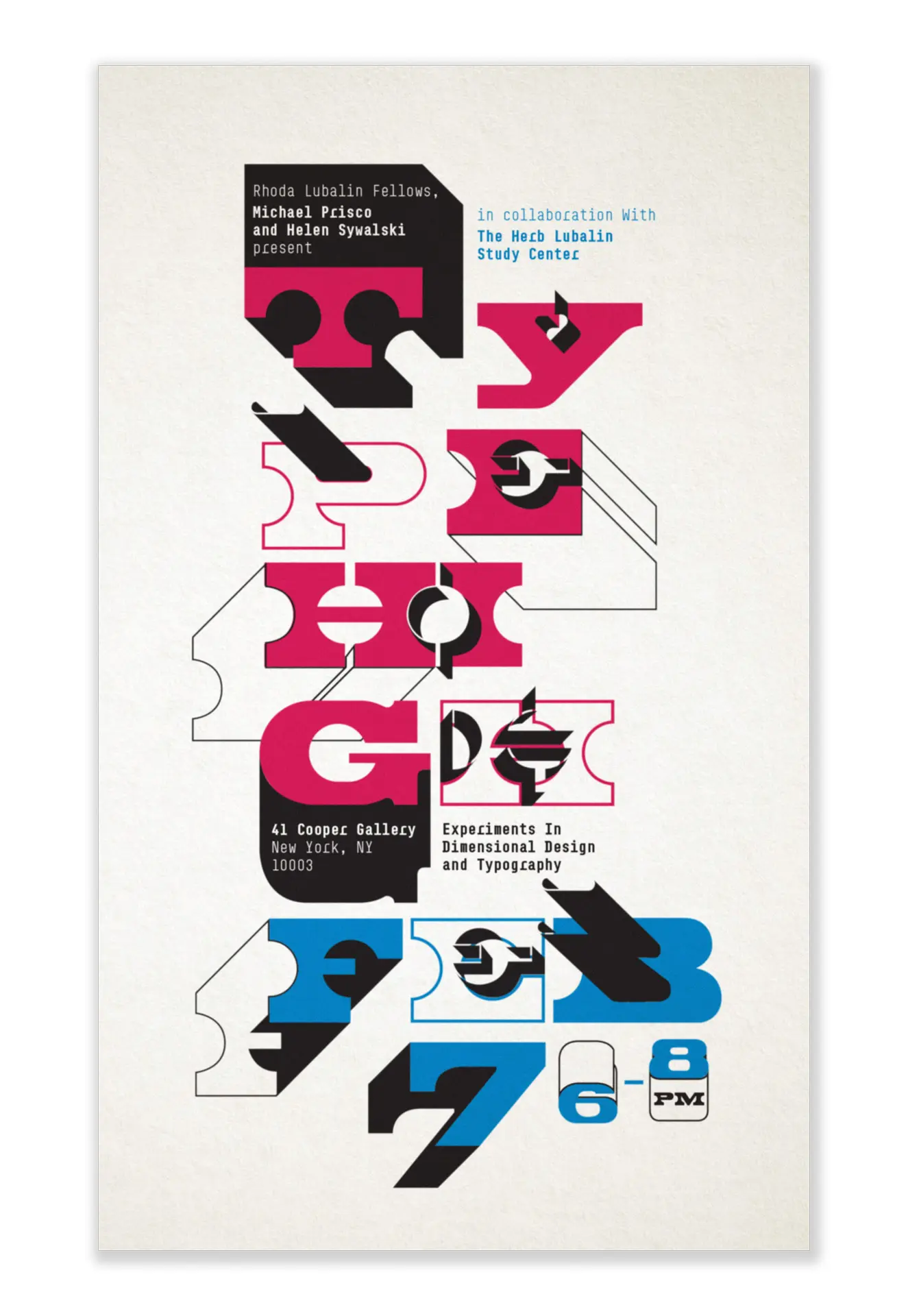 Michael Prisco and Helen Sywalski received the fellowship to support their exhibition Type High: Experiments in Dimensional Design and Typography, which explored the application of type as form, image, and sculpture. This exhibition was awarded a Gold Medal in the 2017 Graphis Design Annual, first place for “built environment” by Core77, and featured in It’s Nice That and AIGA’s Eye on Design.